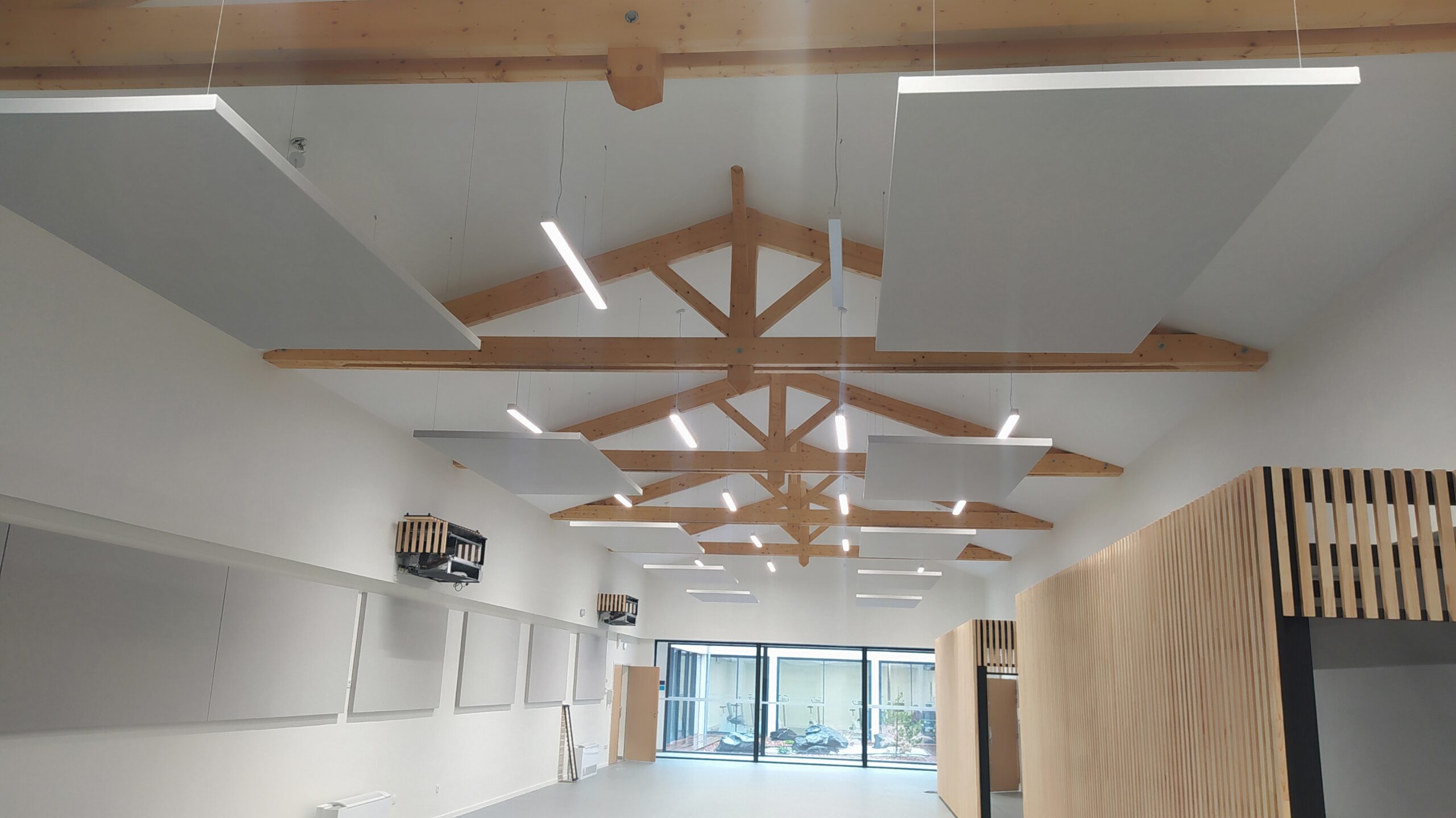 L’aménagement de l’espace peut se faire avec des panneaux acoustiques (panneaux fixés au mur), des plafonds acoustiques (dalles suspendues au plafond), des cloisonnettes , des objets à poser ou à suspendre …