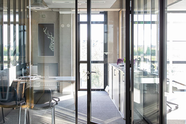 Conçue pour s’intégrer aux environnements de bureaux en secteur tertiaire, cette porte à ossature aluminium affinée est montée sur pivots.