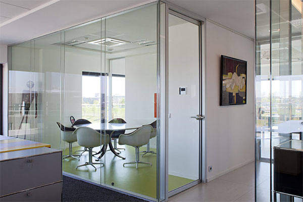 Conçue pour s’intégrer aux environnements de bureaux en secteur tertiaire, cette porte de bureau vitré a une haute performance acoustique. Porte montée en simple vitrage pris en portefeuille dans l’ossature.